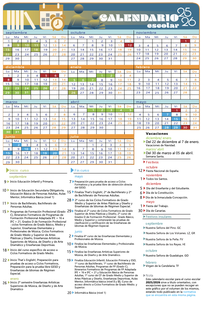 En las tablas de esta página se relacionan todas las fechas de inicio y finalización del curso, excepto las de Educación de Personas Adultas, por la diversidad de enseñanzas que la componen (puedes consultarlas en el siguiente enlace: https://anpecanarias.es/notices/192988).