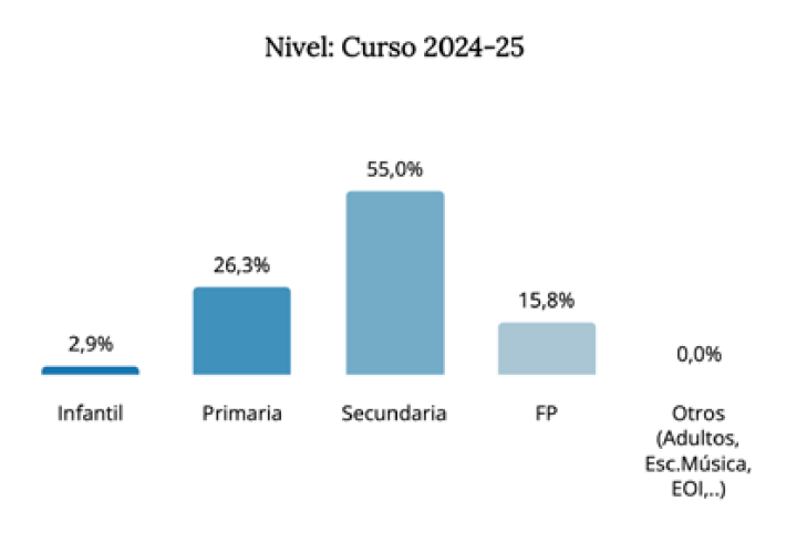 La etapa de secundaria es la que mayor número de casos concentra. Los incidentes contabilizados en secundaria vuelven a crecer, al pasar de 91 en el curso 2023-2024 a 94 en 2024-2025, y suponen más de la mitad del número total de casos atendidos por el servicio. Sin embargo, el mayor repunte del curso pasado se dio en primaria, donde los incidentes denunciados crecieron de 38 a 45 (+18,4%).