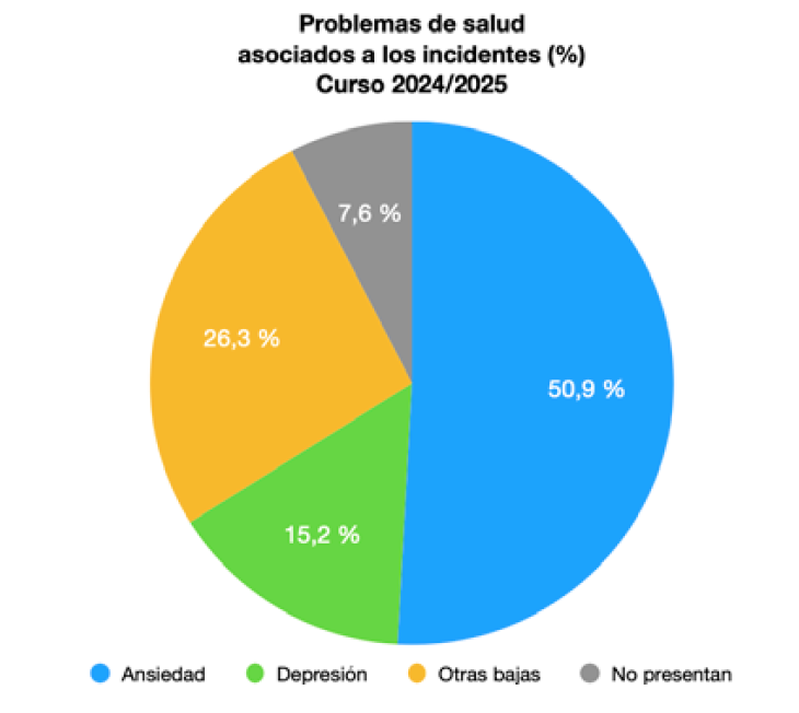La memoria refleja también un aumento muy relevante de los problemas de ansiedad y depresión asociados a incidentes con el alumnado y sus familias. 87 de los docentes afectados por esas situaciones sufrieron cuadros de ansiedad (frente a los 80 del curso anterior), 26 padecieron depresión (frente a 14 en 2023-2024) y a 45 se les tuvo que expedir parte de baja médica por otras causas asociadas a los incidentes (el curso precedente habían sido 32). Así, más del 50% de los/as docentes que denunciaron situaciones de conflictividad padeció ansiedad, alrededor de un 15% sufrió depresión y un 26% se vio obligado a coger la baja por otras causas de salud vinculadas. En este sentido, debemos insistir en la reivindicación de que se reconozcan como enfermedades profesionales las relacionadas con la salud mental derivadas del ejercicio de la docencia.
